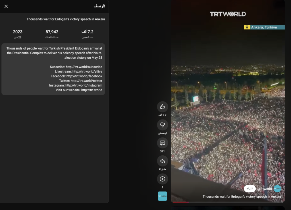 حيث نشرت قناة TRT World مقطع الفيديو على حسابها الرسمي على اليوتيوب، بتاريخ 28\5\2023، حيث أرفق الفيديو بالنص التالي: “ينتظر الآلاف خطاب النصر لـ رجب طيب أردوغان في أنقرة”.